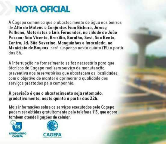 A companhia de água e esgoto da Paraíba comunica através das redes sociais, sobre manutenção em bairros da Capital e Município de Bayeux. Confira!