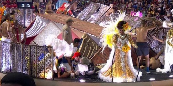 Durante o desfile, uma estrutura de mais de 3 metros, que estava no alto de um dos carros alegóricos da Unidos da Tijuca, despencou para dentro da alegoria no meio da avenida.