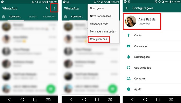 Passo 1. Para editar o seu “Recado” no WhatsApp, basta ir nas configurações de perfil. Para isso, toque no ícone de três pontos, na parte superior direita.