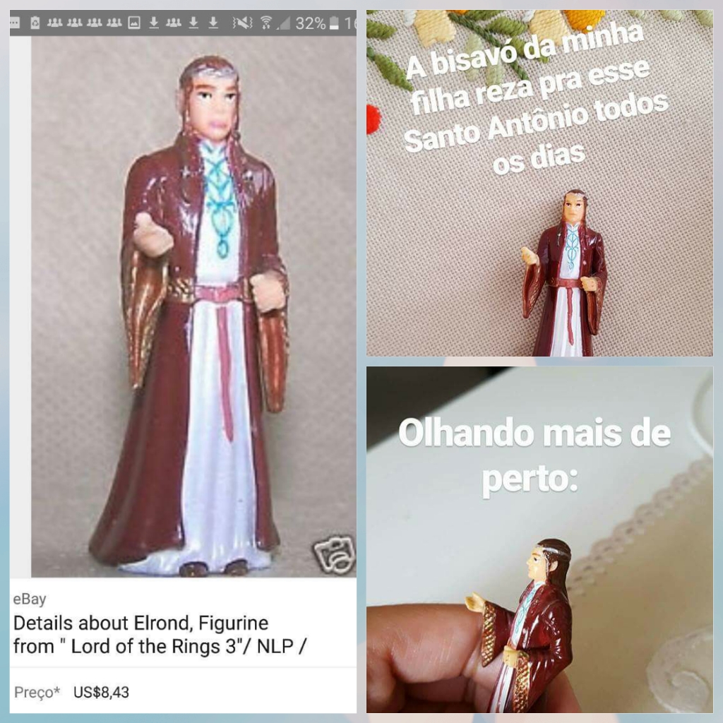 “A bisavó da minha filha reza para esse Santo Antônio todos os dias”, escreveu, publicando junto imagens do “santo” e também de um exemplar do boneco do personagem Elrond à venda na internet, que eram idênticos.