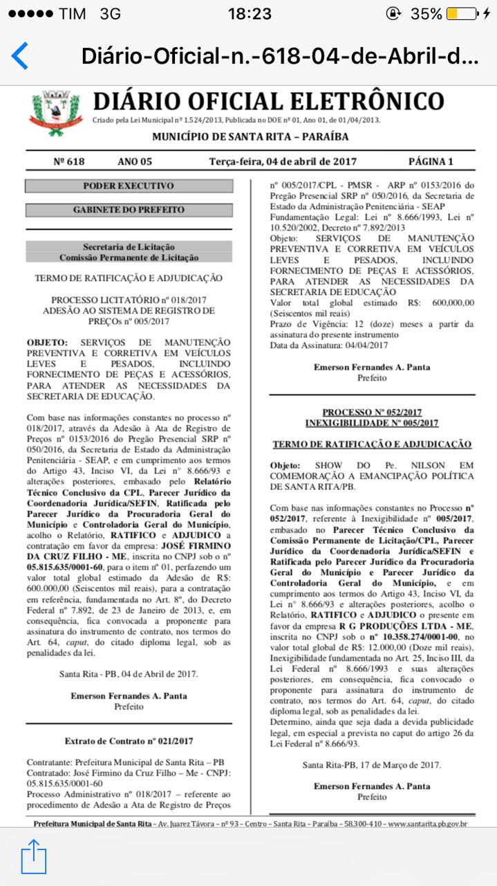 Desta vez uma surpresa no diário oficial do município do dia 04/02, o prefeito Emerson Panta (PSDB) contratou empresa para fazer manutenção preventiva de veículos locados à prefeitura, no valor de R$600 mil reais.