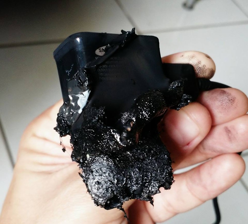 No domingo, ele coloca o aparelho para carregar em casa até que acontece algo nada legal. “Só deu tempo de eu passar um café. Coloquei para carregar, fui na cozinha e logo vi um flash”, conta o publicitário. “O carregador explodiu, derreteu a tomada e a parede ficou toda preta”. “Comprei o carregador e o cabo genéricos da Samsung e meu celular é da Motorola. Ele era muito bem feito, engana qualquer um”, completa Dann.