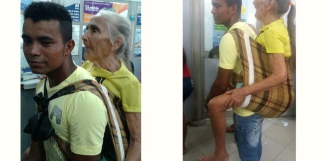 Uma cena inusitada foi flagrada pela aposentada Conceição Benício, de 56 anos, em uma lotérica do Centro da capital do Acre, Rio Branco. Ela conta que por volta das 10h desta segunda-feira (10) viu um rapaz na fila preferencial carregando uma idosa de mais de 80 anos nas costas para que ela fosse sacar o benefício.