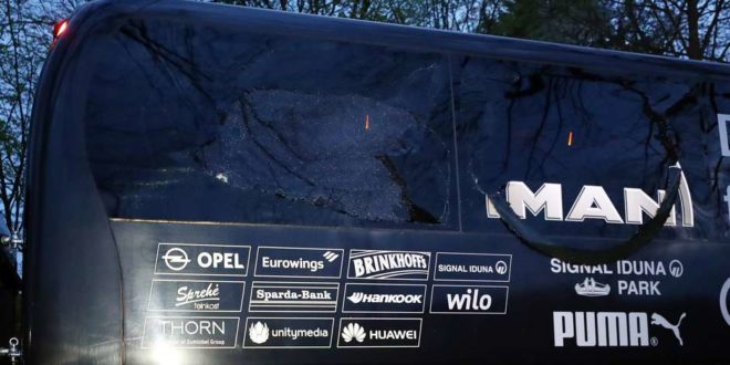 Uma bomba explodiu próximo ao ônibus do Borussia Dortmund na tarde desta terça-feira quando a equipe estava a caminho do estádio Signal Iruna Park para enfrentar o Monaco em jogo de ida pelas quartas de final da Liga dos Campeões. O clube alemão confirmou a informação, e ainda informou que um jogador teria sofrido ferimentos.