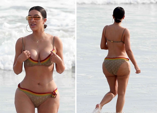 Usando um biquíni da Dior, a socialite cobriu os mamilos com esparadrapos, que aparecem quando ela arruma a parte de cima do biquíni ao tomar um banho de mar. O look escolhido por Kim foi vestido por Gisele Bündchen, quando a modelo estrelou para a grife francesa em 2004.