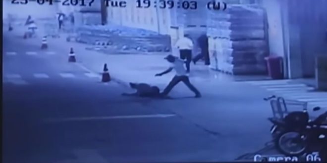 Caída no chão, a vítima ainda é atropelada por um carro, um Kadett com placas de Batatais (SP) que seria do mesmo homem, e que deixa o local na sequência. Em seguida, pessoas que viram toda a movimentação socorrem a mulher às pressas.