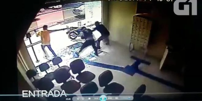 Os dois continuam lutando durante alguns segundos, enquanto o segundo suspeito sai da agência e aciona a moto para facilitar a fuga. O vigilante ainda dispara contra a dupla na moto. Os tiros estilhaçaram as portas de vidro da agência.