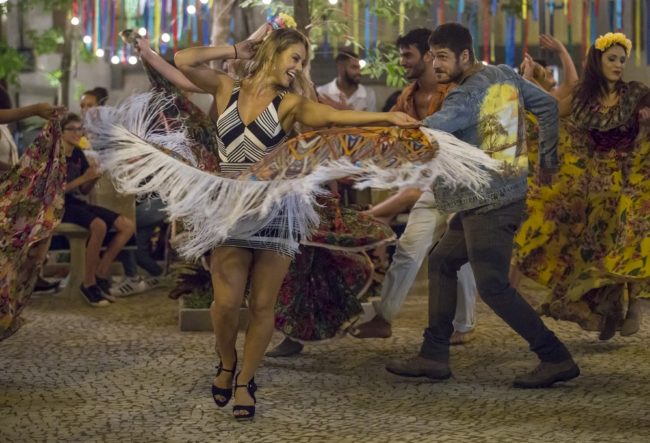 Na festa nortista que Nazaré (Luci Pereira) organiza em Portugal Pequeno, é só o caminhoneiro ouvir os primeiros acordes do carimbó, que ele logo chama a policial para dançar.