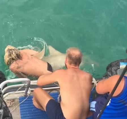 Um vídeo, divulgado na internet, mostra a tentativa do australiano de “domar” a fera marinha. Com uma corda em mãos, ele tenta montar sobre o animal, que ronda o barco onde o rapaz está acompanhado de amigos. Ele chega a puxar o tubarão pela cauda, mas acaba levando uma mordida numa das pernas, na altura da coxa.