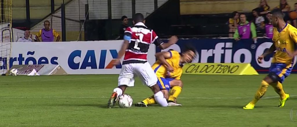 Nas imagens é possível ver parte da perna direita de Vítor totalmente dobrada. O Santa Cruz ainda não divulgou detalhes do estado do jogador, mas a lesão deve deixar o atleta fora dos gramados por um bom tempo. O jogador do Criciúma deu um carrinho com as duas pernas.