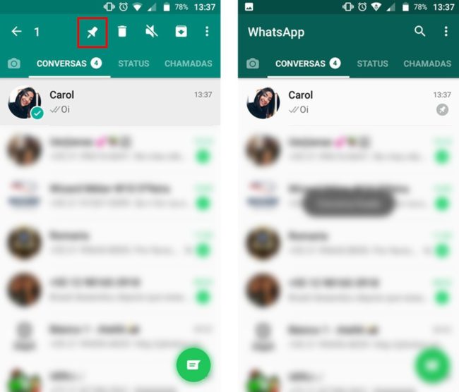 Para fixar uma conversa no WhatsApp, primeiro, certifique-se de que o aplicativo está atualizado. Em seguida, na lista de mensagens, selecione o chat que deseja fixar. Para isso, pressione em cima da conversa. Um menu com algumas opções aparecerá na parte de cima da tela, toque no ícone de pino (o primeiro à esquerda).