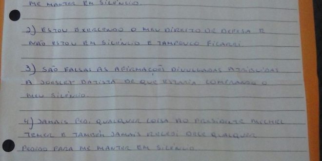 4) Jamais pedi qualquer coisa ao presidente Michel Temer e também jamais recebi dele qualquer pedido para me manter em silêncio.