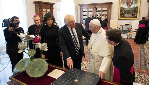 Francisco, por sua vez, entregou a Trump seus três escritos principais: as encíclicas Evangelii Gaudium e Laudato Se e a exortação Amoris Laetitia, além de sua última mensagem da jornada de paz. Ele também abençoou um terço que apresentou aos Trump em uma bandeja.
