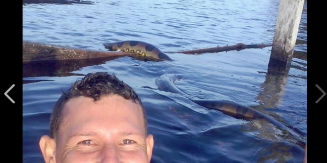 Era para ser uma simples ‘selfie’, mas a companhia do autônomo Carlos Andrade, de 22 anos, na imagem acabou dando o que falar. No registro ele aparece em um rio do município de Nhamundá, a 375 Km de Manaus (AM), com uma sucuri ao fundo. A foto foi publicada no perfil dele no sábado (27) e reproduzida em diversas páginas no Facebook. Uma das postagens já conta com mais de 5.800 curtidas e pelo menos 1.650 compartilhamentos.