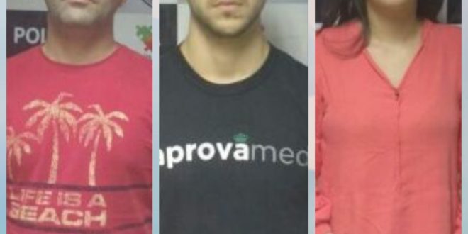 O tenente da Polícia Militar, Moises Williams da Silva ( camisa vermelha), e os estudantes de medicina José Victor Barbosa e Raiane Barbosa Araújo, ambos de 20 anos, foram presos na tarde deste sábado (3), suspeitos de fraudar o vestibular de medicina de uma faculdade particular no bairro Valentina de Figueiredo, em João Pessoa.