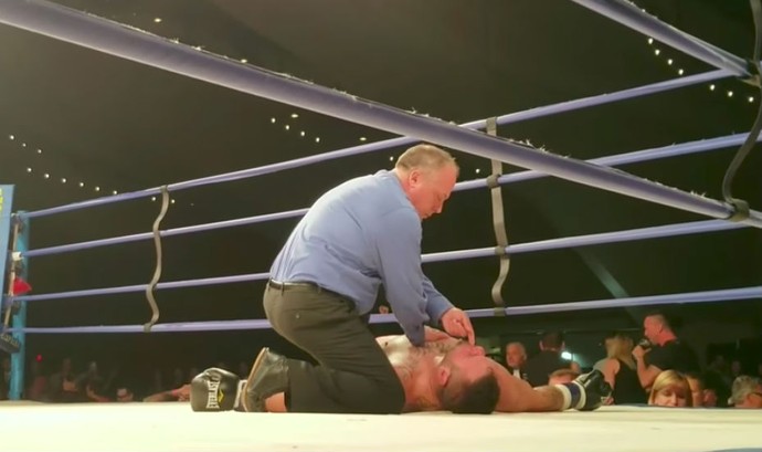 Tim Hague é amparado pelo árbitro após cair nocauteado em luta de boxe (Foto: Reprodução/Youtube)