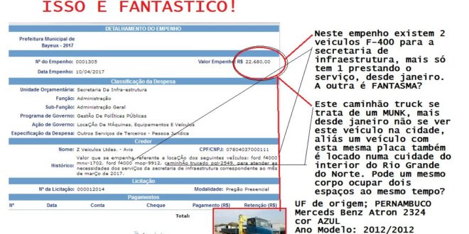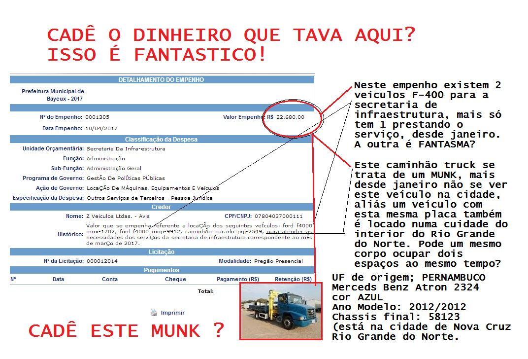 A denúncia é sobre locação de um caminhão Munk, no diário oficial da cidade de Bayeux mostra que o Munk está locado a secretária de infraestrutura por mais de 22 mil reais desde de janeiro.