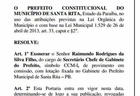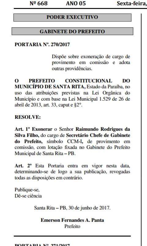 O diário oficial Prefeitura Municipal de Santa Rita de ontem Sexta feira 30 de Junho veio com uma bomba, o Secretário Chefe de gabinete do Prefeito, Raimundo Rodrigues da Silva foi exonerado pelo Prefeito Emerson Panta.