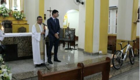 O padre Nicodemos, que celebrou a Missa de cerimônia riu bastante com a atitude irreverente do noivo. Essa é a primeira vez que um noivo vai à igreja de São José de Piranhas de bicicleta.