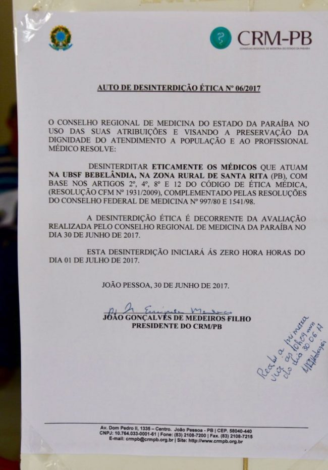 Cinco Unidades de Saúde da Família de Santa Rita foram inspecionadas e desinterditadas na última sexta-feira (30) pelo Conselho Regional de Medicina (CRM). Os locais, que enfrentaram a interdição nos anos de 2015 e 2016, agora voltam a contar com equipe médica para atendimento aos usuários.