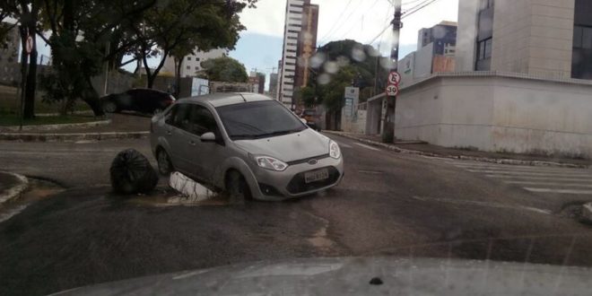 Um carro caiu em um buraco na manhã desta sexta-feira (14) no cruzamento das ruas Governador José Gomes da Silva com a Vandick Pinto Filgueiras, no bairro de Tambauzinho, em João Pessoa.