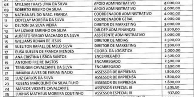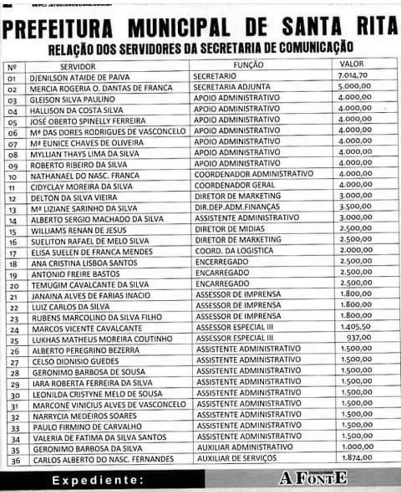 O Prefeito Emerson Panta tem 36 comissionados pela Secretaria de Comunicação com salários de até quase sete mil reais, dos 36 apenas do máximo 10 trabalham, o resto recebem e não presta serviços.