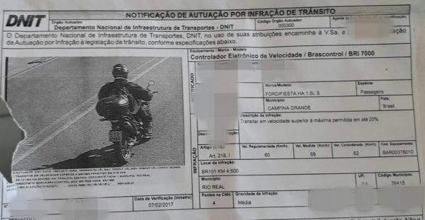 Uma professora universitária de 34 anos que mora no bairro da Palmeira, em Campina Grande, recebeu uma multa de trânsito com foto de uma moto que estaria pilotando em alta velocidade, na Bahia. A correspondência do Departamento Nacional de Infraestrutura de Transporte (DNIT) chegou para a mulher na segunda-feira (7).