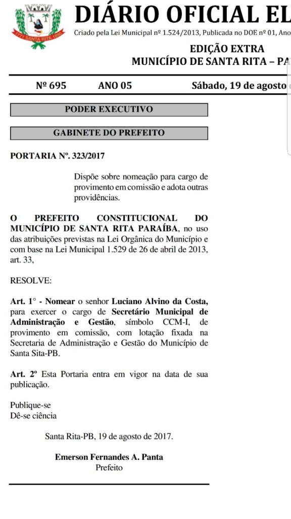 No diário oficial deste sábado (19), que não deveria funcionar, publicou nomeação de novo do secretario na mesma pasta, Secretaria de Administração do município de Santa Rita.