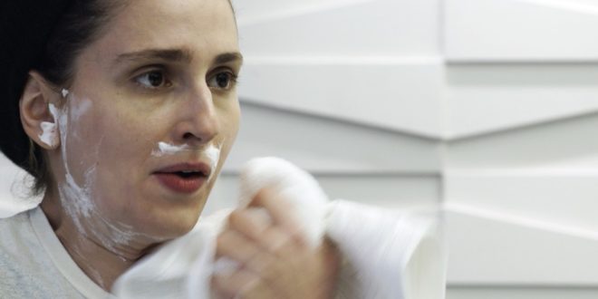 Joyce (Maria Fernanda Cândido) entra no quarto da filha sem bater e dá de cara com Ivana (Carol Duarte) simulando que está fazendo a barba. A mãe leva um susto!