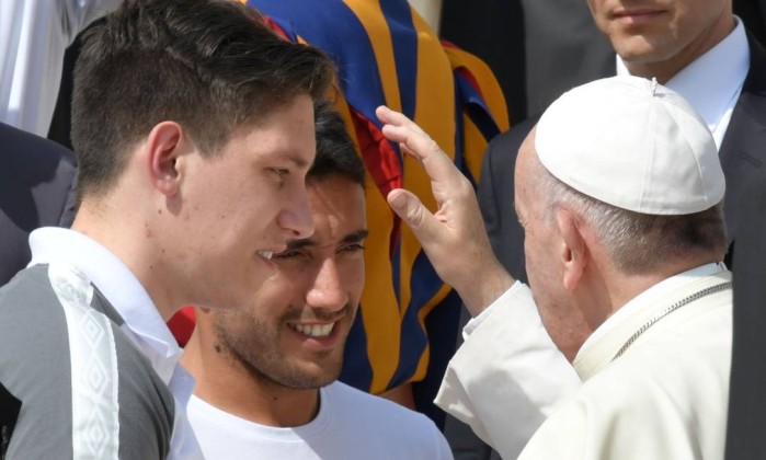 ROMA — O Papa Francisco saudou nesta quarta-feira, em audiência geral no Vaticano, a comissão técnica e os jogadores da Chapecoense. Entre eles, estavam Alan Ruschel e Jackson Follmann — sobreviventes da tragédia que deixou 71 mortos em novembro passado. O pontífice abençoou funcionários, parentes de vítimas e esportistas.