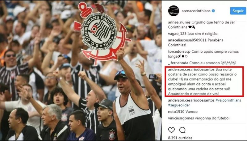 Empolgado com o gol de Jô no último domingo (17), que garantiu a vitória de 1 a 0 do Corinthians sobre o Vasco, um torcedor do Timão acabou se excedendo na comemoração e quebrou uma cadeira da Arena. Horas depois, ele procurou a administração do estádio por meio do Instagram para saber como ressarcir o clube pelo prejuízo.