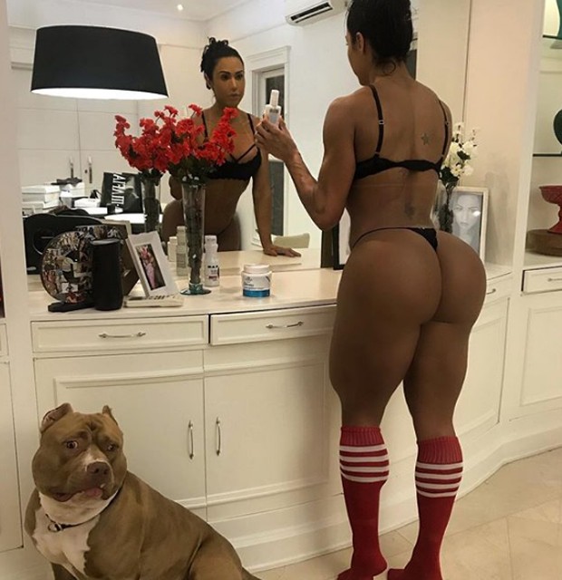 Na imagem, a musa fitness, casada com o cantor Belo, chamou a atenção do seguidores por estar com uma lingerie bem pequena e ganhou vários elogios.