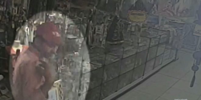 As imagens mostram que o suspeito se assusta ao entrar na loja, se benze e segue para o caixa. Ao perceber que o local é monitorado, o homem quebra a câmera.