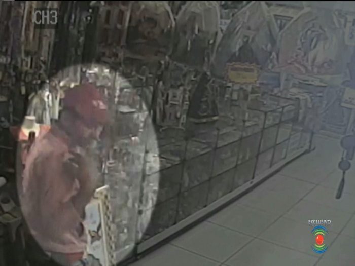 As imagens mostram que o suspeito se assusta ao entrar na loja, se benze e segue para o caixa. Ao perceber que o local é monitorado, o homem quebra a câmera.