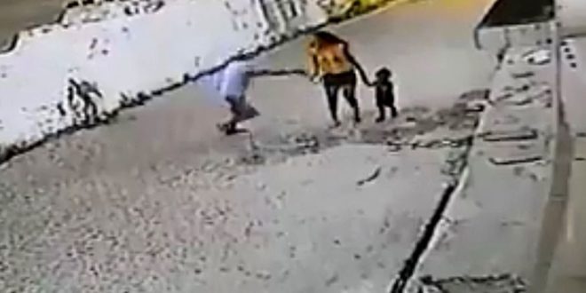 O circuito de segurança de uma residência flagrou o momento em que a vítima caminhava pela rua com o filho, quando o bandido aparece e aborda a mulher tentando tomar o celular, ele joga a vítima no chão, toma o telefone e vai embora. A criança com medo, se afasta dos dois.