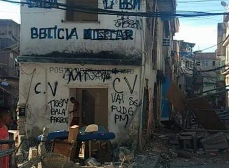 A fachada foi pichada com a sigla da facção que domina o tráfico da comunidade. Também foram escritos xingamentos aos PMs. Janelas e porta da edificação foram totalmente destruídas.