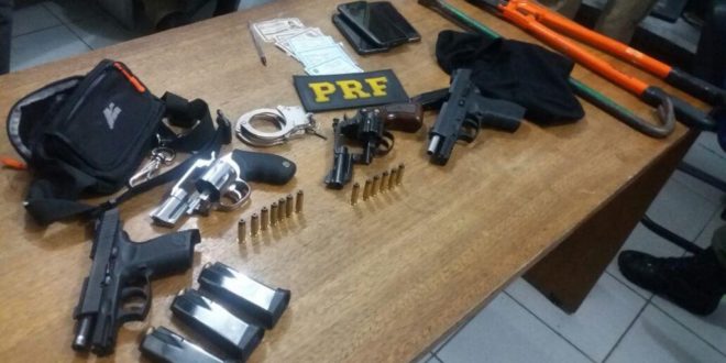 De acordo com informações do Inspetor Ed Porto, da PRF, com eles foram encontradas armas irregulares, duas pistolas e dois revólveres, um pé de cabra, um alicate industrial, além de um capuz preto.