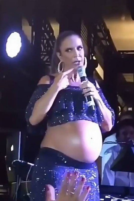 Na apresentação, a artista, que exibe seu barrigão de mais de seis meses, também cantou com a cantora Simone, da dupla com Simaria.