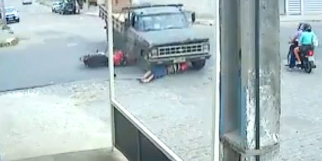 O motociclista acaba indo parar debaixo do veículo pesado, livrando-se por pouco das rodas do caminhão.