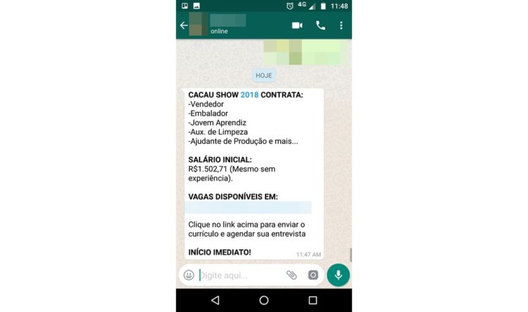 Um novo golpe no WhatsApp usa o nome da marca de chocolates Cacau Show para oferecer vagas de emprego. O problema é que as supostas oportunidades são falsas e, segundo informações do DFNDR Lab, laboratório da PSafe especializado em segurança digital, 1 milhão de pessoas já clicaram no link malicioso em apenas 24 horas.
