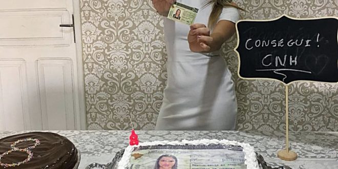Home / CIDADES / Após oito reprovações, mulher faz festa com ‘bolo de CNH’ ao tirar habilitação