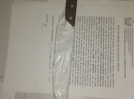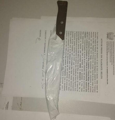 Após receber voz de prisão o acusado juntamente com a faca apreendida foram conduzidos e apresentados na delegacia da cidade de Alhandra, onde foi realizada a devida Autuação em Flagrante Delito.