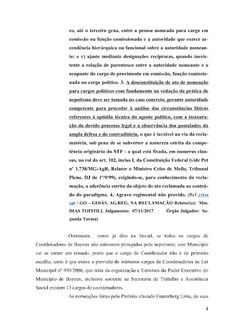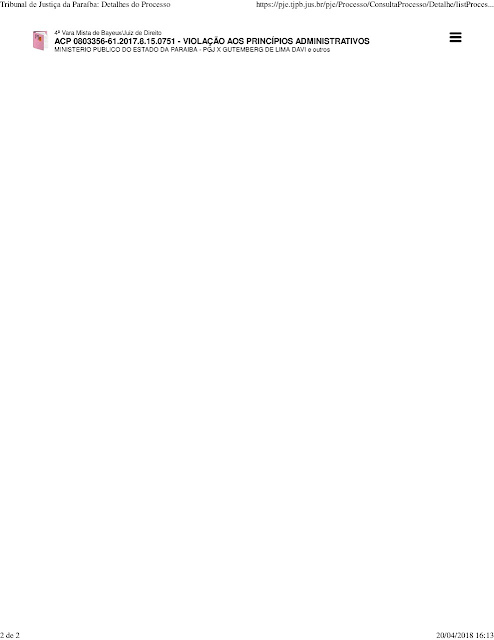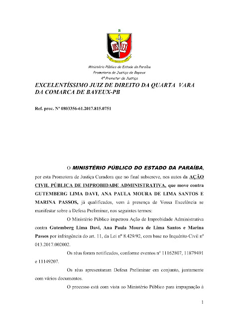 Em peça datada de 20 de fevereiro de 2018, O ministério Público do Estado da Paraíba impetrou ‘Ação de Improbidade Administrativa’ contra o prefeito afastado de Bayux, Berg Lima e outras duas pessoas, por infringência do art. 11, da Lei nº 8.429/92, com base no Inquérito Civil nº 013.2017.002002.