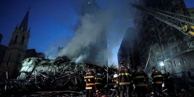SÃO PAULO – Um prédio de 24 andares desabou durante um incêndio de grandes proporções no Largo do Paissandu, no centro de São Paulo, na madrugada desta terça-feira, 1º. Um edifício vizinho também pegou fogo nos três primeiros andares, mas não corre risco de colapso. A Igreja Evangélica Luterana, que fica ao lado do prédio em chamas, também pegou fogo e parte da estrutura desabou.