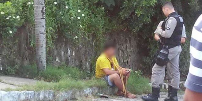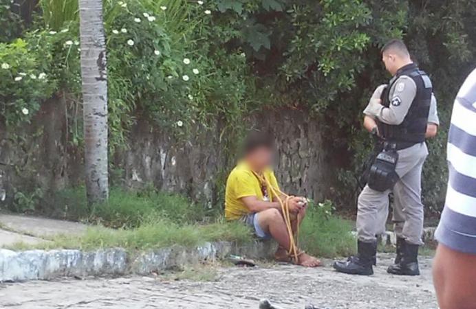 Ele teria acabado de realizar um roubo quando foi perseguido por várias pessoas que, depois de amarrá-lo com uma corda, o agrediram com socos e chutes.