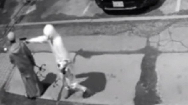 Os dois suspeitos parecem apontar armas para a vítima, que corre para dentro de um prédio, seguida pelo suspeito de branco. Quando o homem alcança um lance de escadas é atingido nas costas pelo suspeito, que abandona a cena do crime junto com o comparsa.
