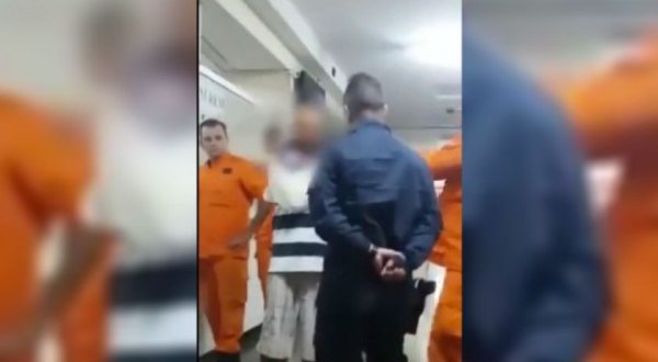 A imagem mostra alguns bombeiros conversando com o paciente, que estava com um dos braços imobilizado. Em seguida, o militar, fardado e armado, se coloca na frente da vítima. Segundo depois, o policial dá um tapa na cara do homem.