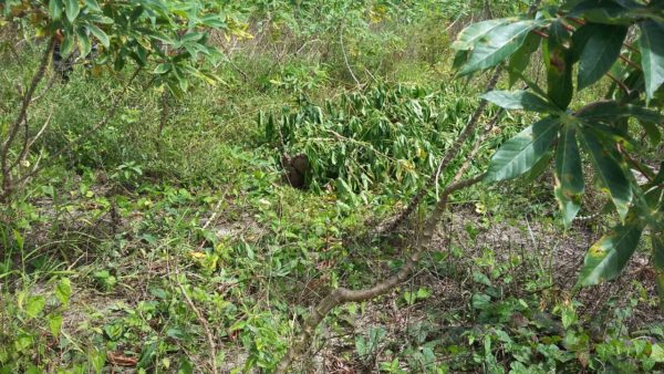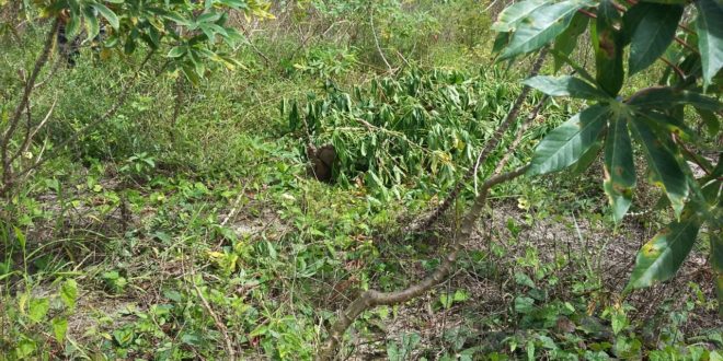 O corpo estava coberto por folhas da plantação e não é possível identificar a causa da morte, apenas após a chegada da perícia.