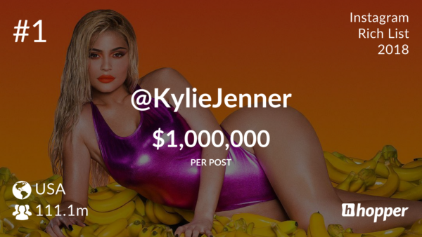 Este é o segundo ano do ranking. Em 2017, a cantora Selena Gomez liderava. Kylie Jenner estava na 4ª posição. Em 2018, a irmã de Kim Kardashian deu um salto em popularidade e assumiu o posto de celebridade mais bem paga do Instagram. O número de seguidores passou de 95 milhões para 110 milhões, e o preço por um post patrocinado subiu de US$ 400 mil para US$ 1 milhão.