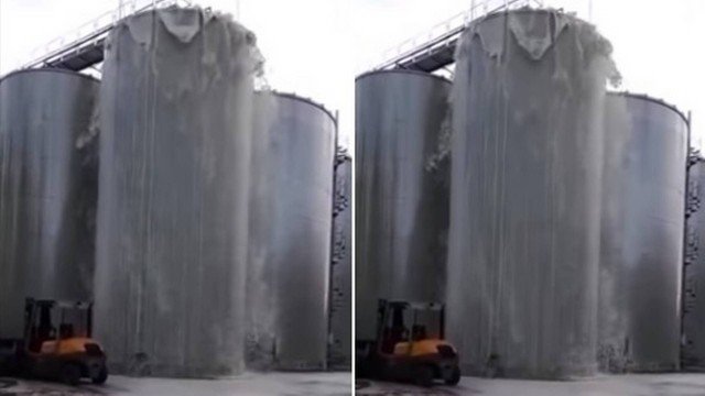 Um funcionário filmou o momento em que o líquido borbulhante escapava de um imenso compartimento metálico: